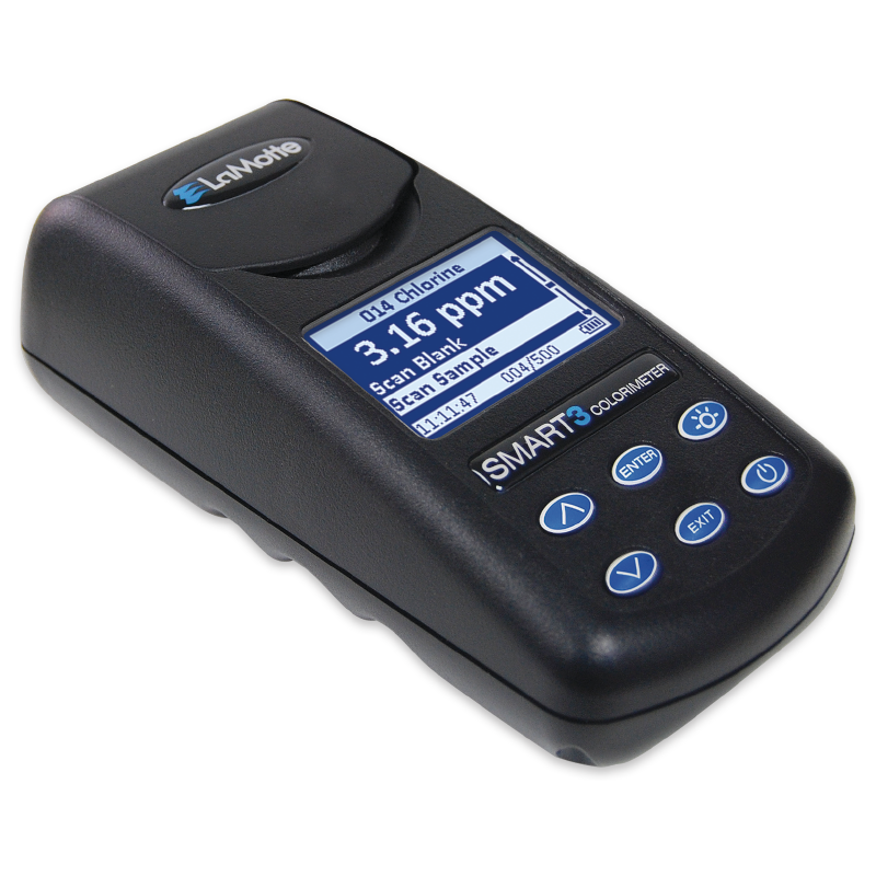 El compacto colorímetro SMART® 3 es ideal para el análisis de agua en campo o en laboratorio. El software fácil de usar permite al analista elegir un factor de prueba entre más de 60 calibraciones preprogramadas para sistemas de reactivos LaMotte.