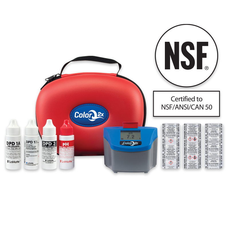 El fotómetro profesional de piscina y spa portátil Waterproof Bluetooth® ColorQ® 2x PRO 7 mide directamente el cloro libre (DPD), cloro total (DPD), bromo (DPD), pH, alcalinidad, dureza calciática y ácido cianurico (estabilizador) directamente en una pantalla digital.