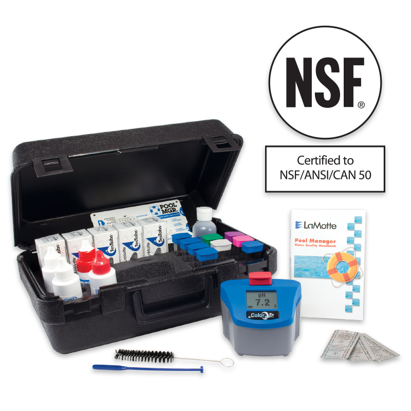 El fotómetro mide directamente nueve pruebas que incluyen cloro libre (DPD), cloro total (DPD), bromo (DPD), pH, alcalinidad, dureza calciccia, ácido cianuríco, cobre e hierro, directamente en una pantalla digital. El medidor de mano es fácil de usar y cuenta con reactivos líquidos económicos que miden 288 pruebas por botella de 60 mL para cloro libre, cloro total, bromo y pH.