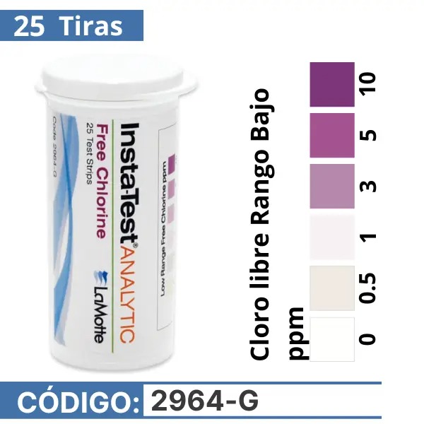 Las tiras reactivas Insta-Test® de LaMotte son un aliado indispensable ya que están diseñadas para proporcionar un análisis rápido y preciso en cada uso. Las tiras 2964-G son una forma práctica de analizar niveles de cloro libre de rango bajo en agua. Se presentan en un frasco de plástico impermeable y duradero que incluye una escala de colores claramente impresa, lo que facilita la interpretación de los resultados.