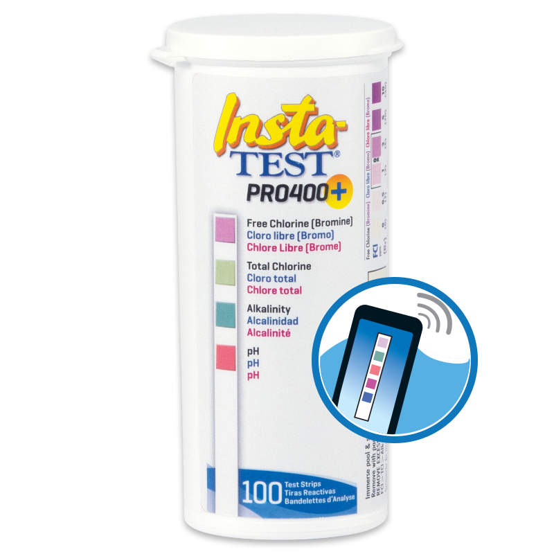 Insta-TEST® PRO 400 Plus mide cloro libre de 0 a 10 ppm, bromo de 0 a 20 ppm, cloro total de 0 a 10 ppm, alcalinidad de 0 a 240 ppm y pH de 6,2 a 9,0 con resultados instantáneos.