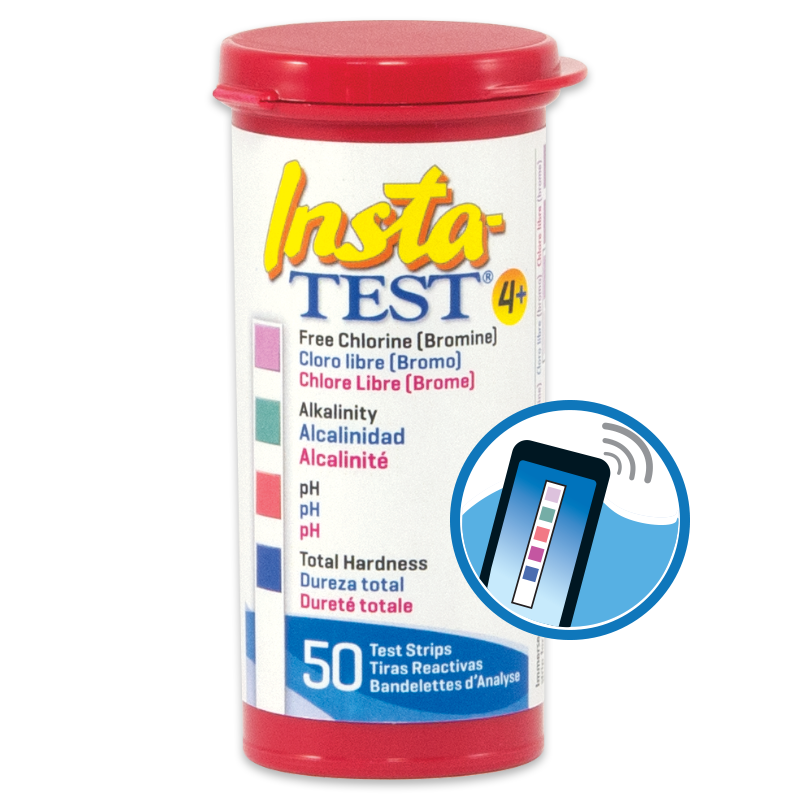 La tira de piscina y spa Insta-TEST 4 Plus mide Cloro libre 0-10 ppm, bromo 0-20 ppm, alcalinidad total 0-240 ppm, pH 6,2-9,0 y dureza total 0-800 ppm.