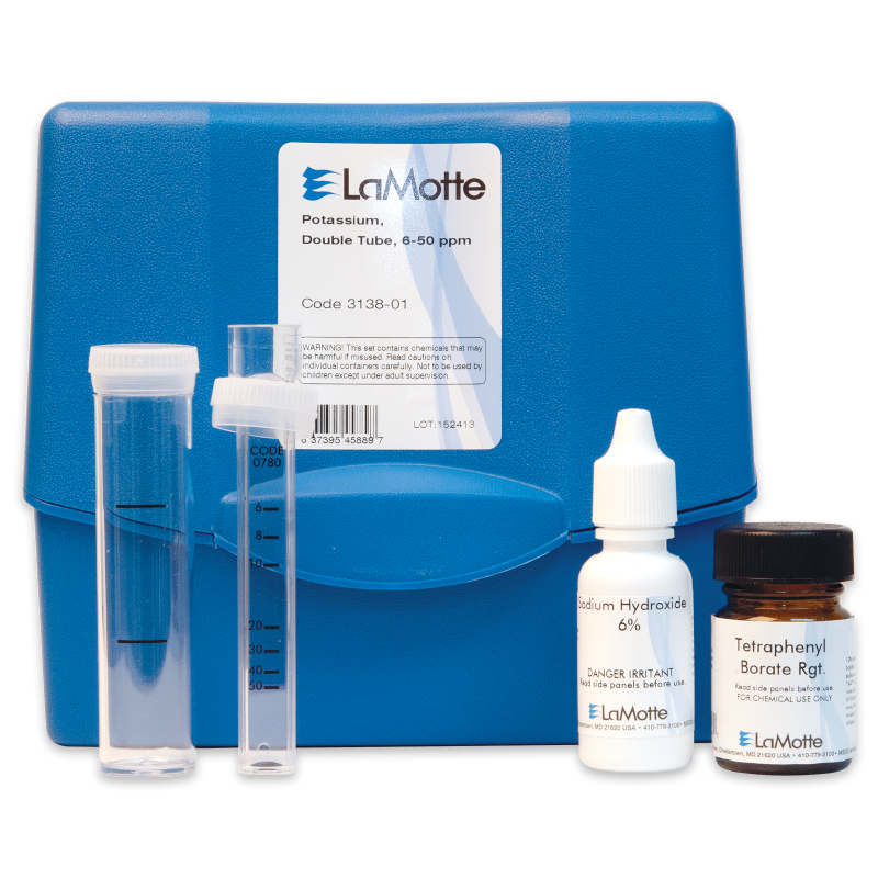Este kit detecta potasio utilizando un tubo de lectura de turbidez. El rango y la sensibilidad son 10, 20, 30, 40, 60 ppm K+.