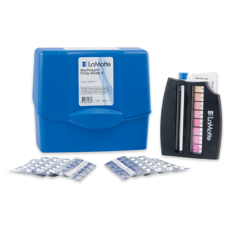 Este kit de prueba de aluminio mide el aluminio en agua usando el comparador Octa-Slide 2. Se formará un color rosa a rojo cuando el aluminio reacciona con el Eriocromo Cianine R, a pH 6. El rango y la sensibilidad son de 0-0,5 ppm Al3+.
