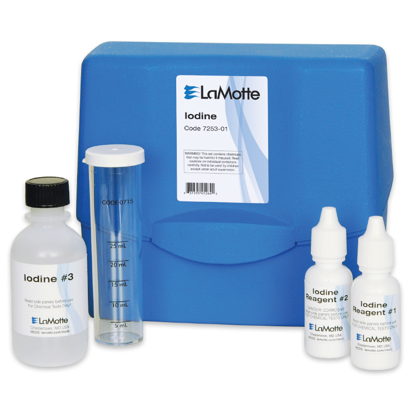 Este kit detecta yodo usando el método de la pipeta cuentagotas. El rango/sensibilidad es de 0-50 ppm/1 ppm en2.