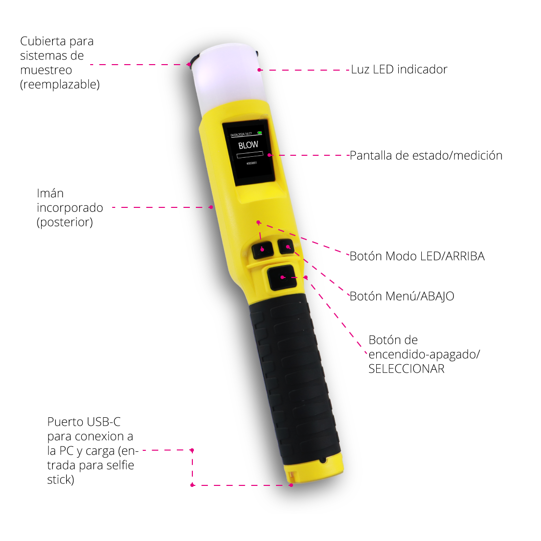 Alcoholímetro que se conecta vía bluetooth a cualquier dispositivo móvil y obtiene una visualización instantánea de resultados, con su significativa mejora en niveles de seguridadgarantiza resultados confiables y consistentes.