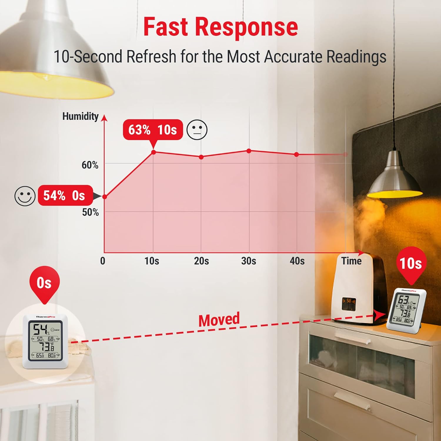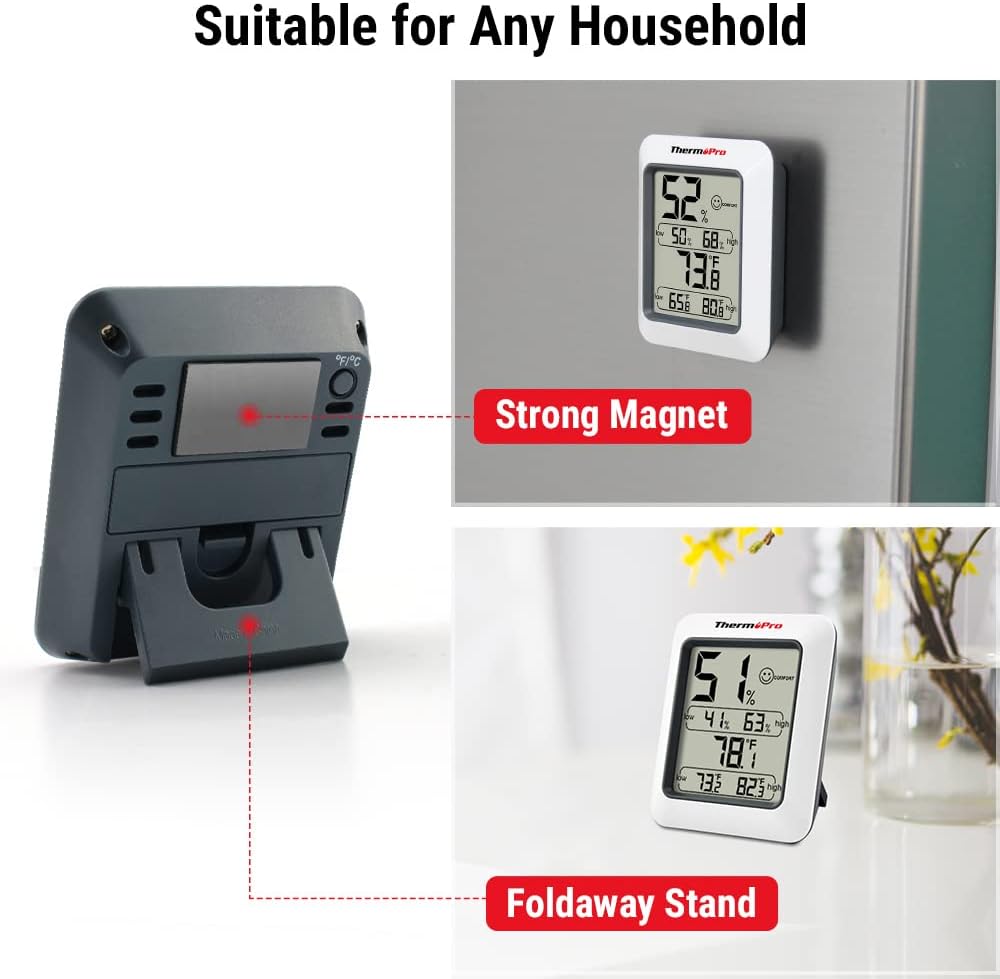 Con lecturas de temperatura y humedad altamente precisas y un amplio rango de medición, el medidor de humedad TP50 es el dispositivo doméstico perfecto para optimizar las condiciones de vida para usted y su familia. Este monitor de temperatura y humedad lo actualiza regularmente en registros altos y bajos, lo que le permite hacer comparaciones inteligentes con el contexto correcto. El sensor de humedad extremadamente sensible de esta unidad le indica sus niveles de confort actuales para que pueda mantenerse al tanto de los cambios en su entorno interior.