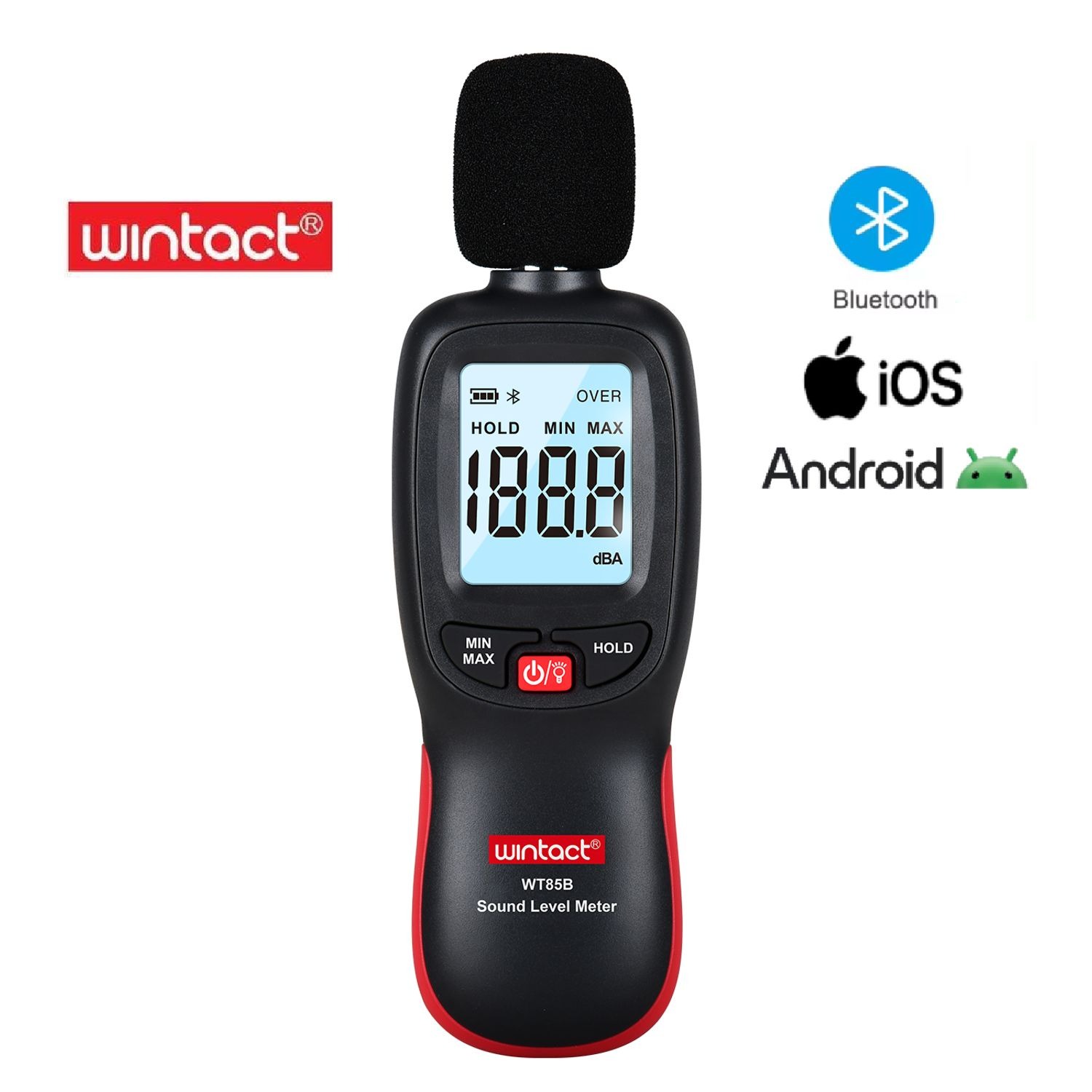 • Sonómetro digital Bluetooth con característica de corrección A. El filtro A corresponde a la sensibilidad de frecuencia del oído humano. También tiene la función de mantener el valor máximo y señalización de batería baja.